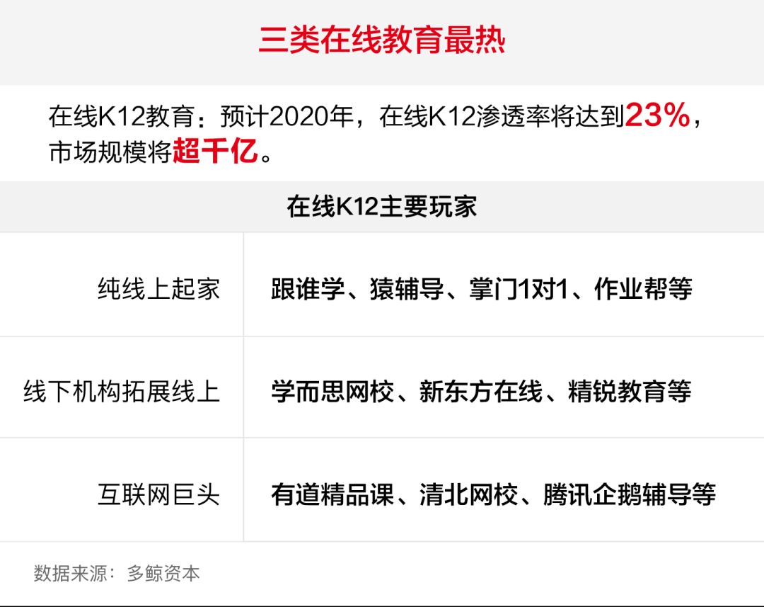 隨著升學競爭的長期存在,K12課外輔導已經成為不可動搖的需要。多鯨資本數據顯示,截至2018年,國內K12學生人數超過1.74億,相應的K12課外輔導市場超過4000億元。傳統教育機構、互聯網巨頭、互聯網團隊等不同背景的創業者紛紛涌入,以英語、數學為主。其中優質項目吸金能力強,紅杉中國、GGV、IDG等一線資本均完成布局。過去一年,在線k12企業融資金額最高的是“一對一”E輪融資,融資金額3.5億美元;其次是“小盒子科技”1.5億美元的D輪融資。