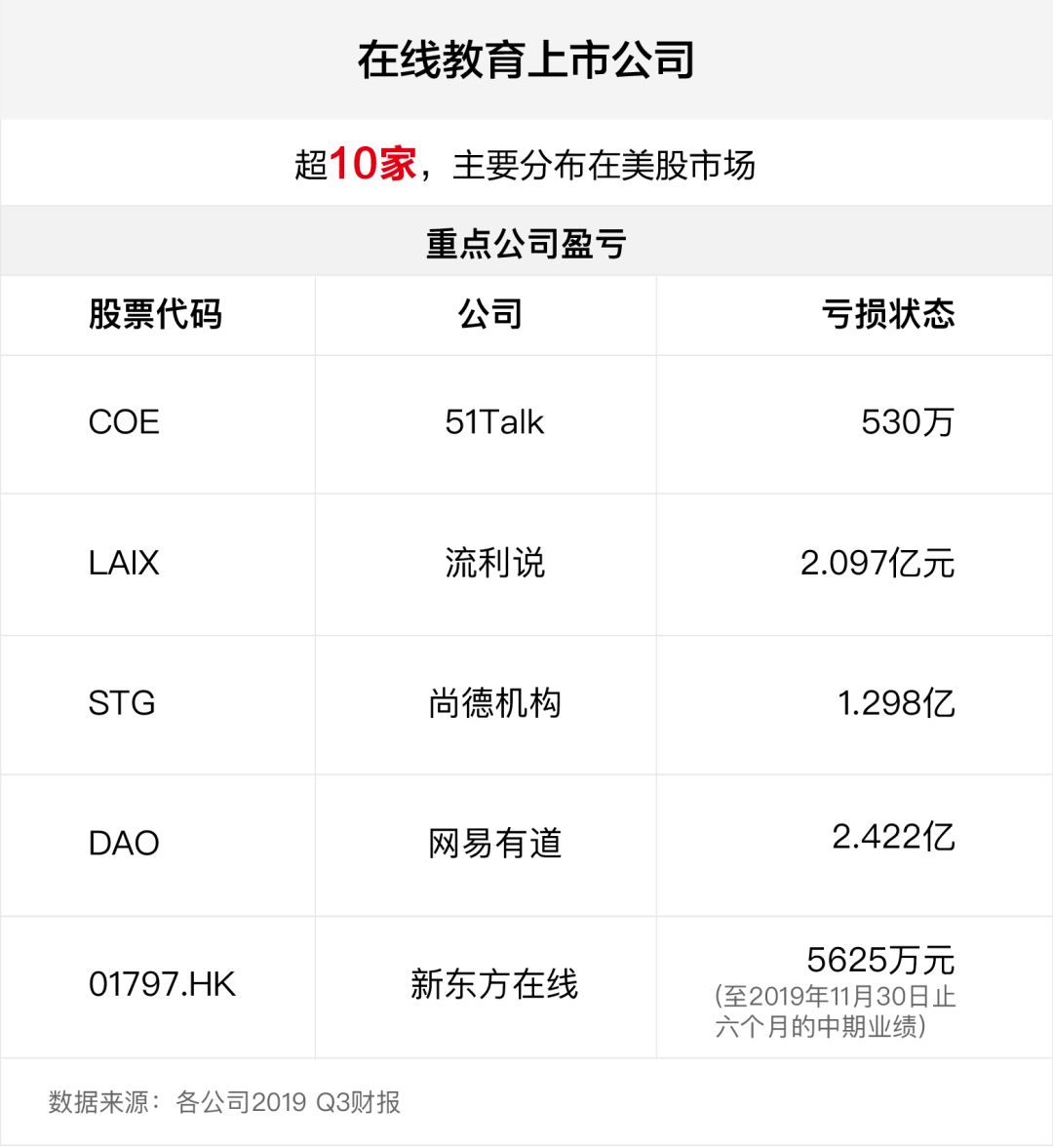 記者注意到,目前成功上市的網絡教育公司有10多家,大部分集中在美國股市。根據已公布的2019年第三季度財報顯示,流利談話、51Talk、尚德、新東方在線等知名公司均出現不同程度的虧損。